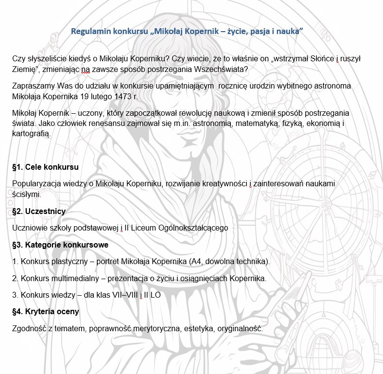 Regulamin konkursu - „Mikołaj Kopernik – życie, pasja i nauka”