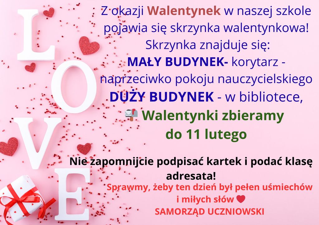Jak co roku, w ten wyjątkowy walentynkowy czas chcemy zaprosić Was do podarowania dobrego słowa osobie, która jest tego warta, a nie zawsze jest na to czas, chęć czy okazja. Taką możliwość właśnie Ci dajemy! Skorzystaj i daj radość innym. Pamiętaj, że dobre słowa i miłe gesty to wielki dar dla drugiego człowieka. Bądź więc Wielki/a – przygotuj Walentynkę i wrzuć ją do walentynkowej skrzyneczki:)